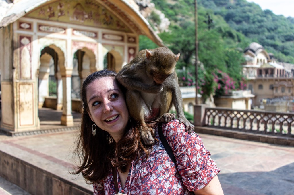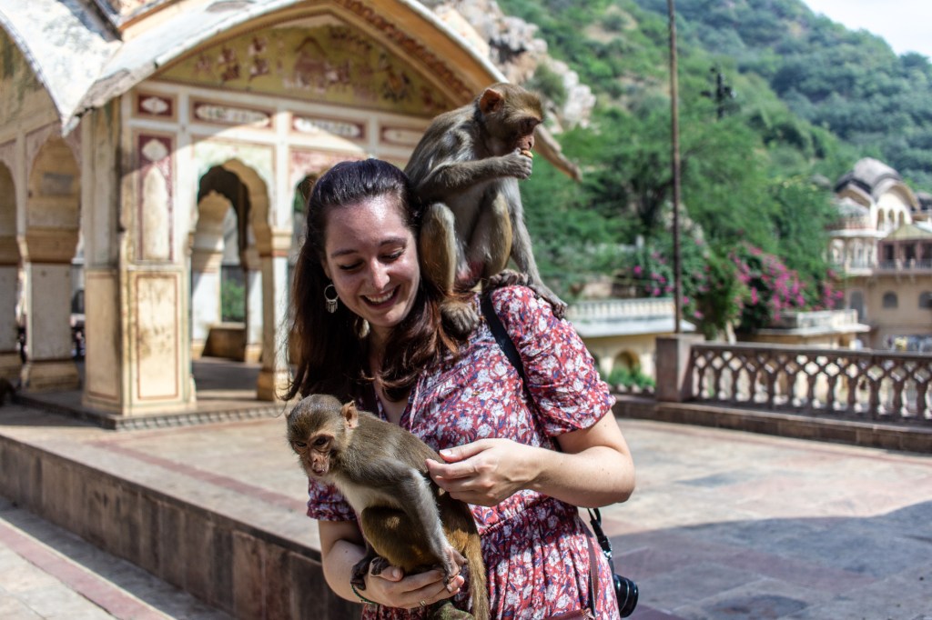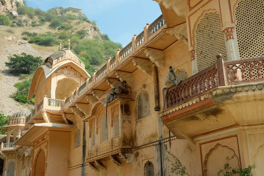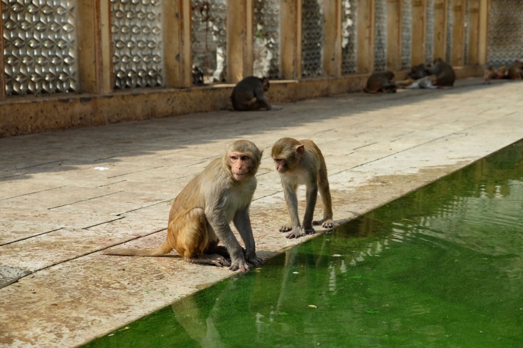 Galtaji is a series of Hindu temples built on a natural spring in the mountains just outside of Jaipur. Pilgrims come to bathe and pray, but tourists come for another reason: these dilapidated temples have also become home to dozens of moneys.
