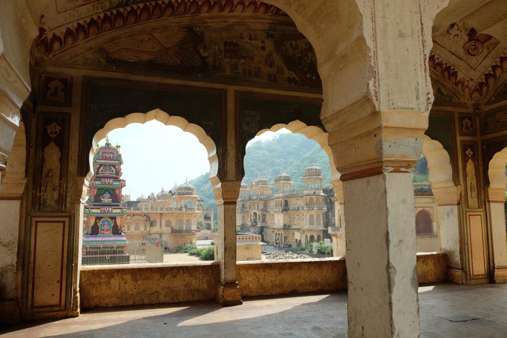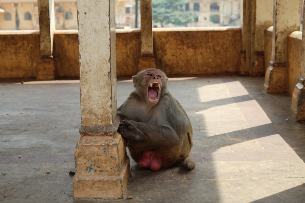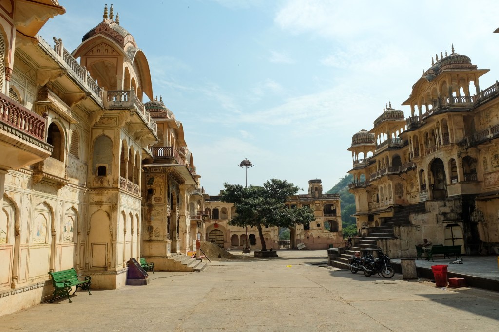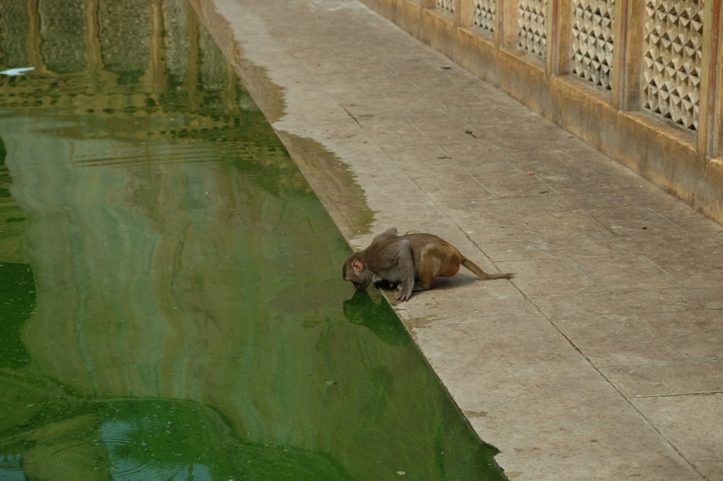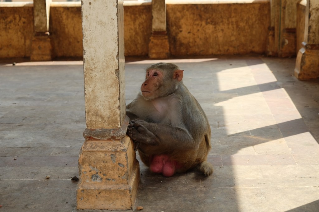 Galtaji is a series of Hindu temples built on a natural spring in the mountains just outside of Jaipur. Pilgrims come to bathe and pray, but tourists come for another reason: these dilapidated temples have also become home to dozens of moneys.