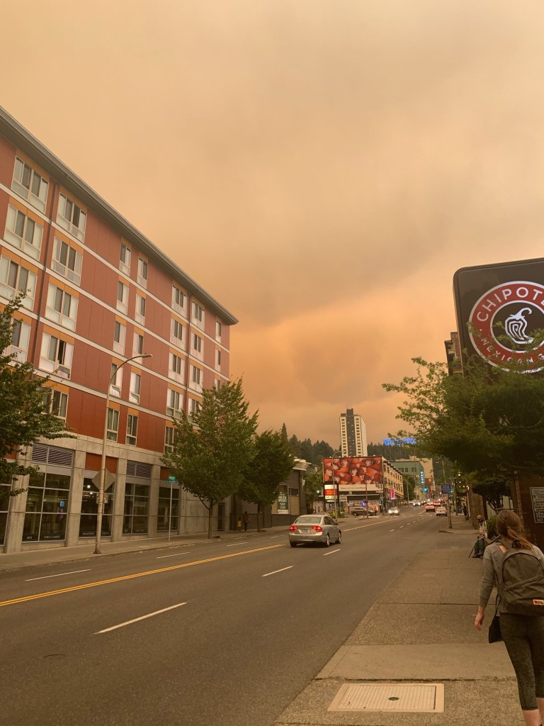 Then the state (and the entire West Coast) caught on fire, and plans changed one more time. Overnight, the city turned from an idyllic summer into an eery, sepia-toned, version of itself. The air smelled like smoke and the sky became a brown haze. The temperature dropped, and the sun turned red. Our air quality was so hazardous it was literally off the scale. I watched fro my apartment as neighbors wore gas masks to walk their dogs. After a few days, I was constantly lightheaded, my voice turned raspy, and I was attempting to sleep on the floor of my closet to get away from the windows.